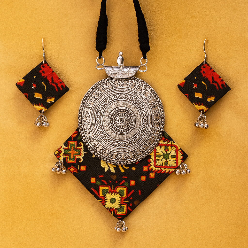 Handmade Indigo Lotus Printed Fabric Pendant Set For Women