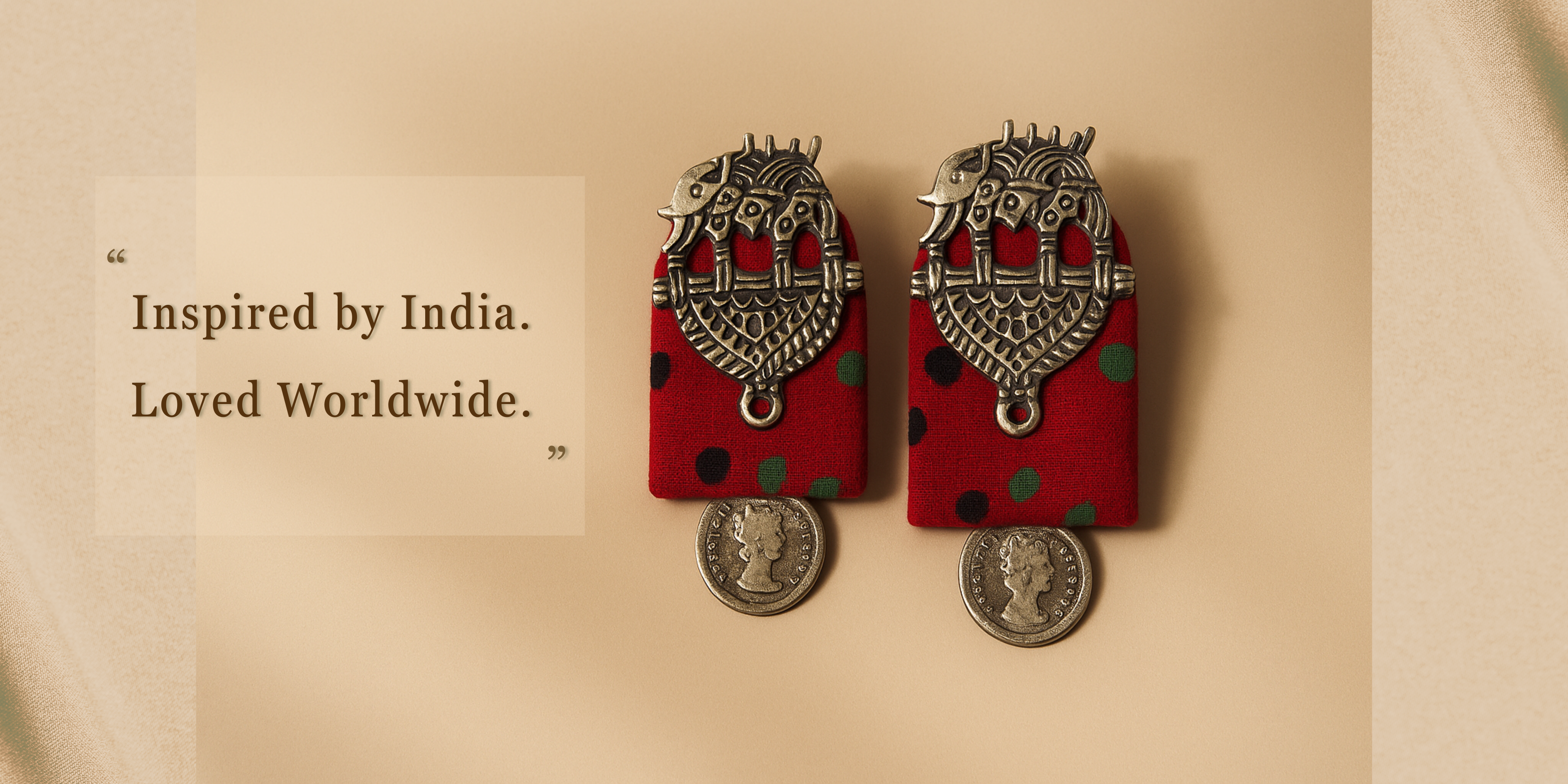 Handmade Elephant Design Red With Antique Coin Studded Fabric Earrings For Women