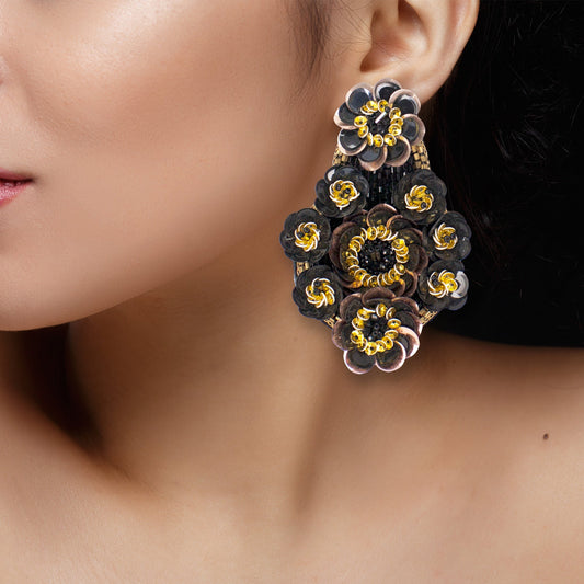 Handmade Black Floral Design Sequence Work Dangler Embroidered Earrings For Women