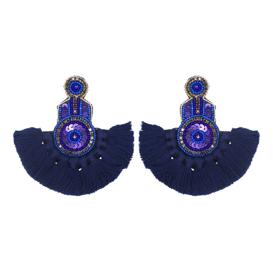 Handmade Beaded Blue Floral Design Tassel Dangler Fabric Earrings For Women