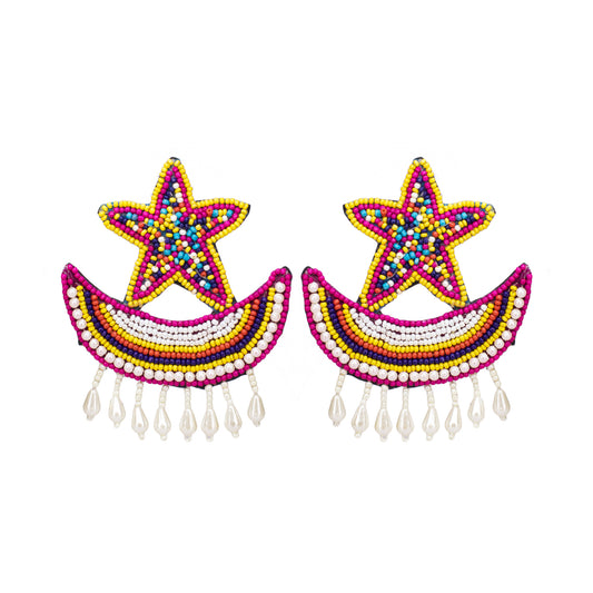 Star Moon Multi-Color Hand Embroidered Beaded Upcycled Fabric Earrings For Girls