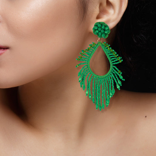 Handmade Beaded Green Drop Shape Dangler Earrings For Women