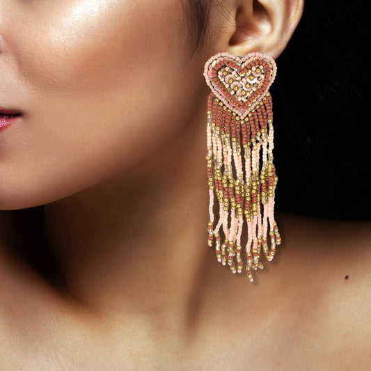 Handmade Embroiderd Pink Heart Shape Beaded Stud With Hanging Beads Fabric Earrings For Women