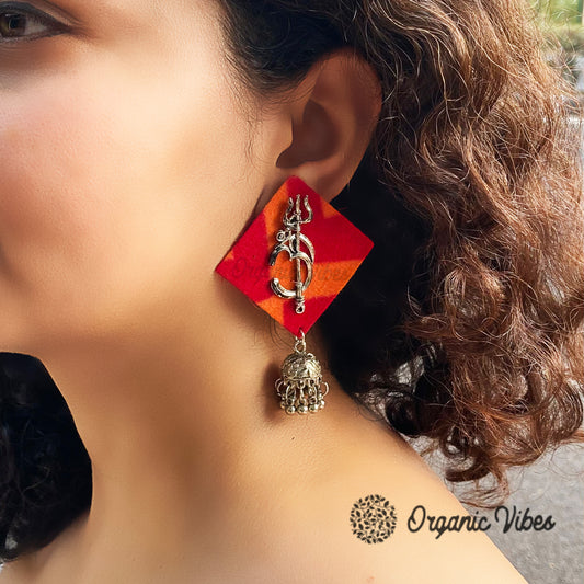 Handmade Square Shape Fabric with Oxidised Silver Shiva Trishul Studs Design with Dangler Jhumka Earrings For Women