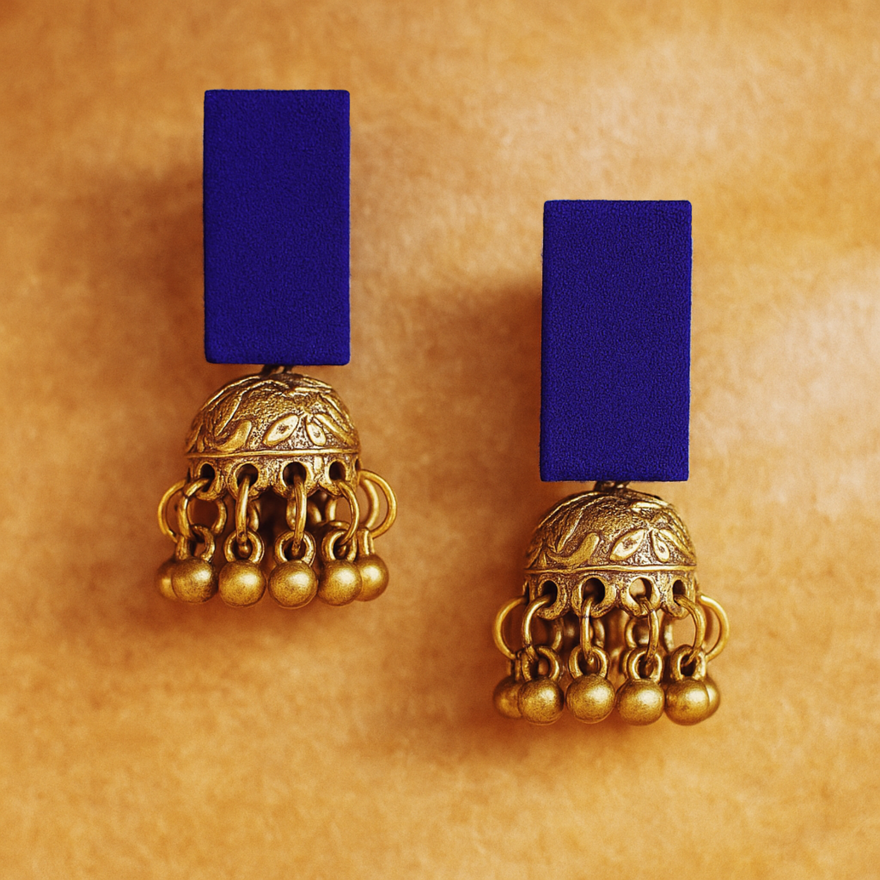 Handcrafted Blue Fabric Earrings with Golden Brass Jhumki