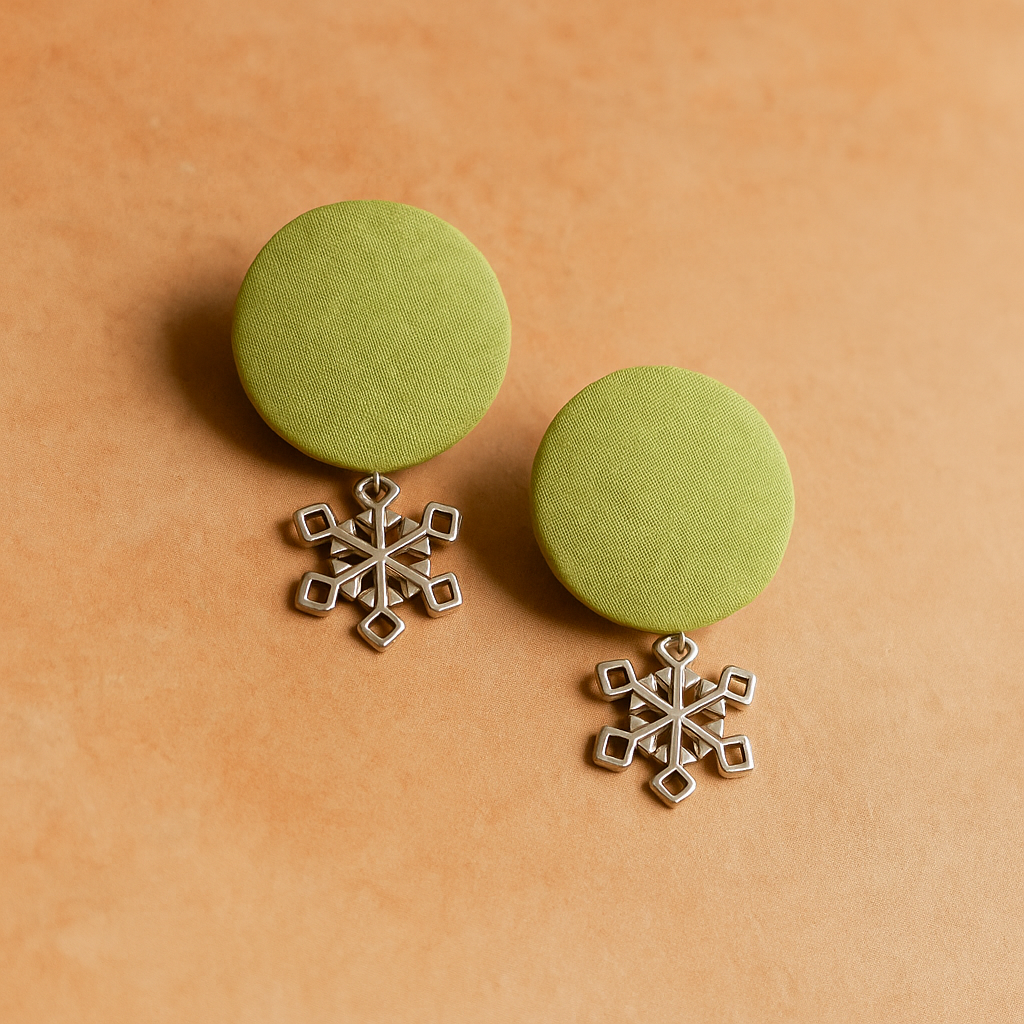 Handcrafted Sustainable Green Fabric Stud Earrings with Silver Snowflake Charm