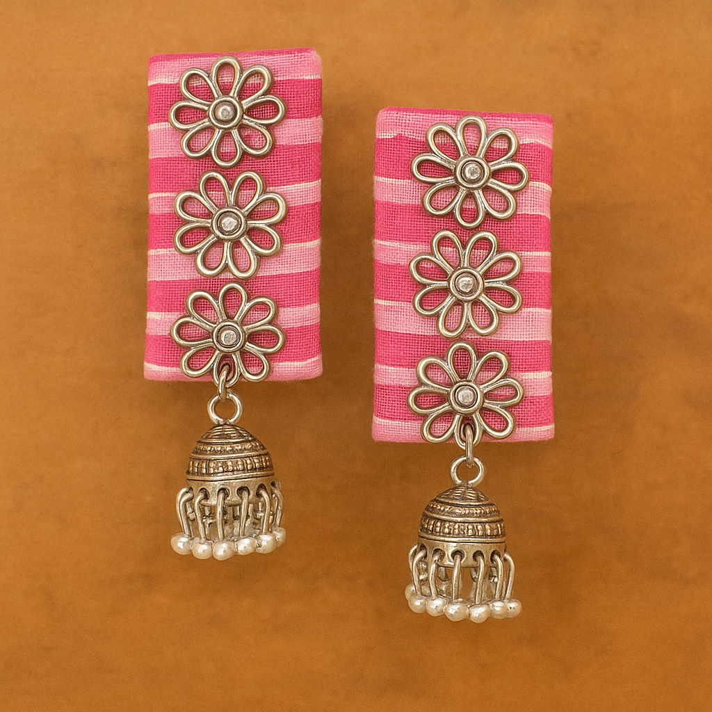 "A beautiful pair of pink and white striped Handmade Fabric Earrings made of upcycled clothes. With these Pink white stripes with silver flowers and Jhumki, make you look extremely well and gracefully speak a lot without going loud about your bold feminine personality. Perfect for giving a traditional touch to your modern outfit and also can go with jeans and a kurta. This unique pair of Fabric earrings are perfect for a casual day-out, a festival, a party, or a traditional gathering. "