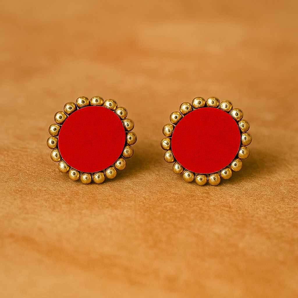 Red Handcrafted Fabric Stud Earrings with Golden Accents
